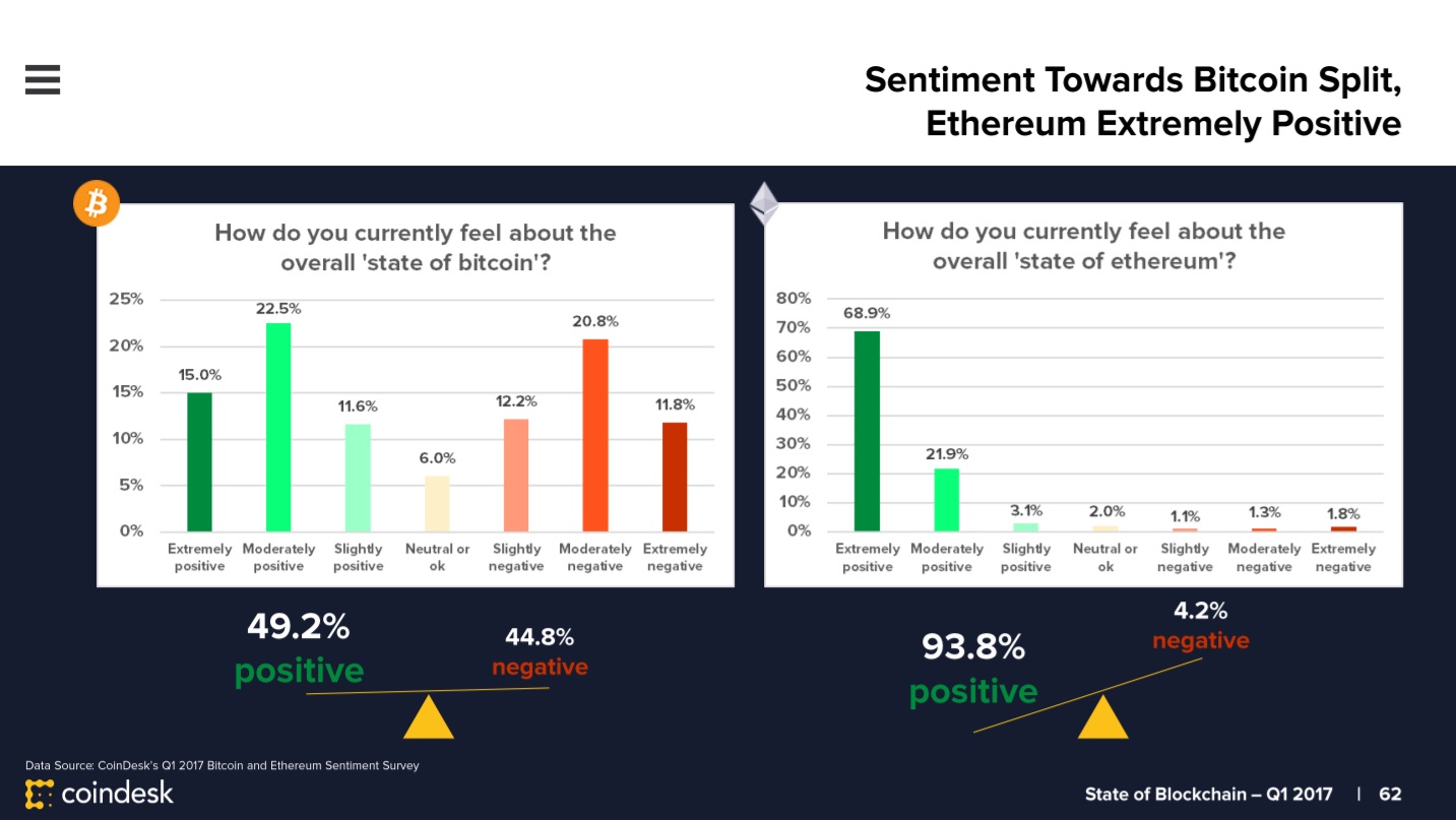 Ninety-four percent of respondents to our 'Bitcoin and Ethereum Sentiment Survey' indicated that they were positive on the outlook for ethereum – almost three times as many as for bitcoin. The main reasons for the disillusionment with bitcoin appear to be the high fees, the increasing centralization and the outlook for scaling.