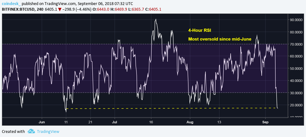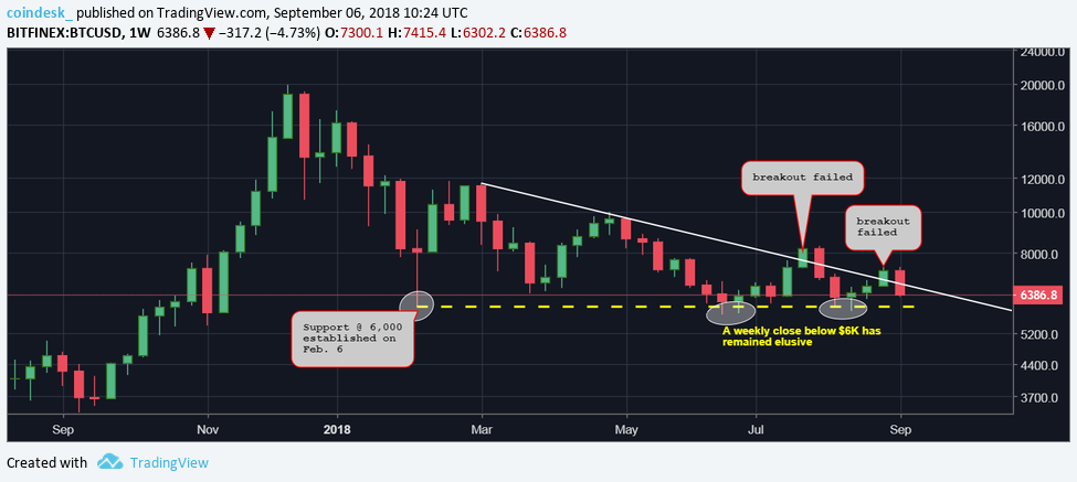 As seen in the above chart, the bears have repeatedly failed in the last 11 weeks to secure a weekly close (Sunday's UTC close) below $6,000 (Feb. 6 low), signaling the sell-off from the record high of $20,000 has run out of steam.